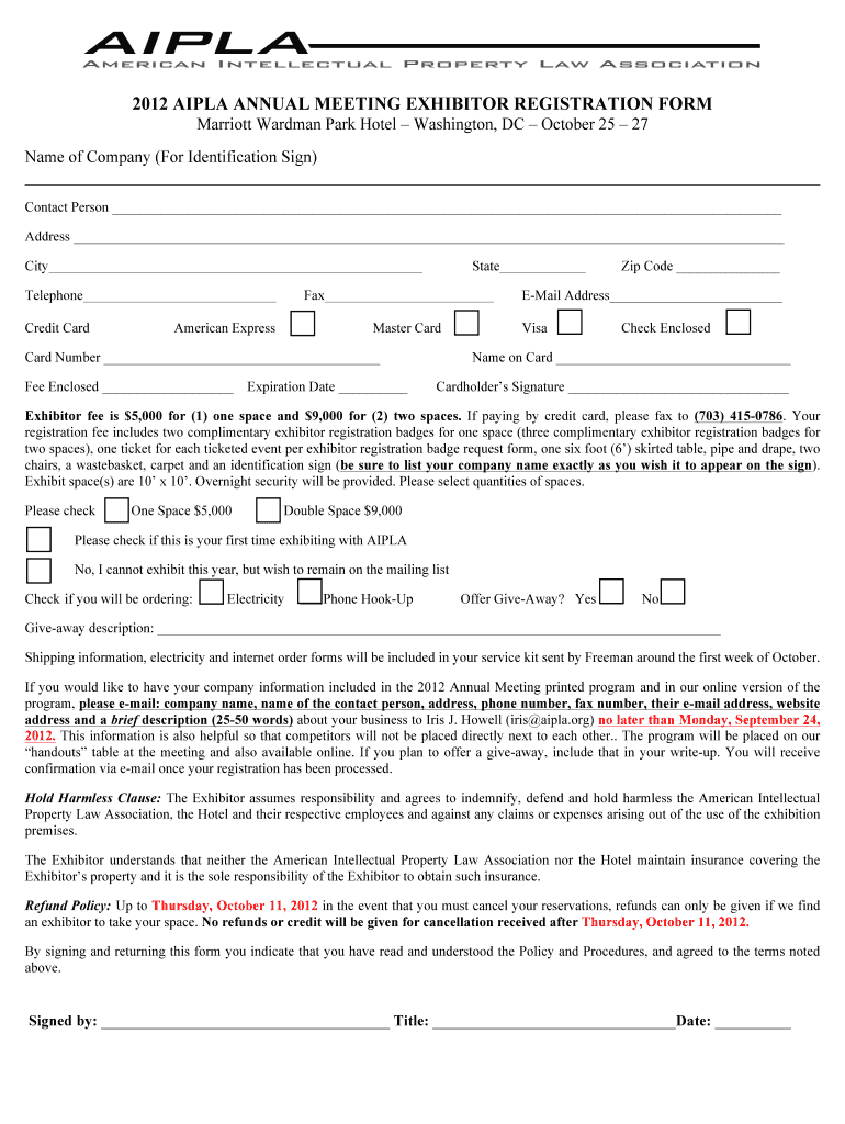 Get the free 2012 AIPLA ANNUAL MEETING EXHIBITOR REGISTRATION FORM - aipla