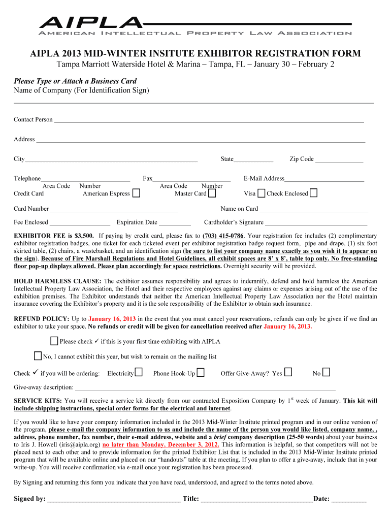 Get the free AIPLA 2013 MID-WINTER INSTITUTE EXHIBITOR REGISTRATION FORM - aipla