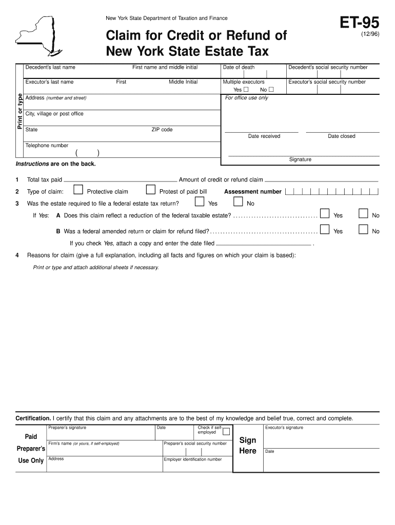 This form is used to claim a credit or refund of New York State estate tax, including protective claims and protests of paid bills.