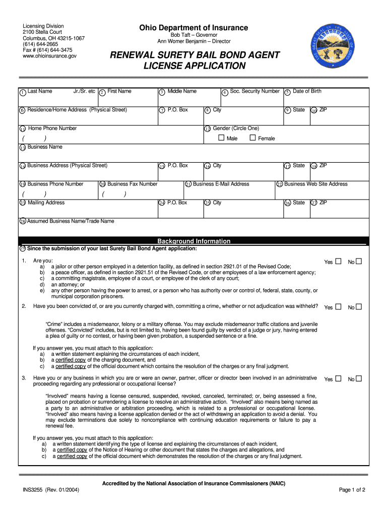 This document is an application for the renewal of a Surety Bail Bond Agent license in Ohio, including personal and business information, background questions, and certification for truthful information