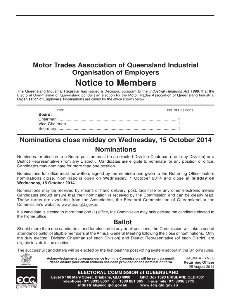 Motor Trades Association of Queensland Industrial Organization of Employers Notice to Members The Queensland Industrial Registrar has issued a Decision, pursuant to the Industrial Relations Act 1999,