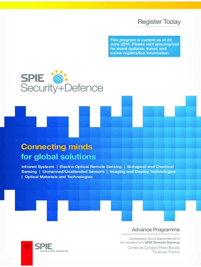 This document outlines the programs, events, and registration details for the SPIE Security + Defence conference held in September 2010, covering topics related to optical and infrared systems, remote