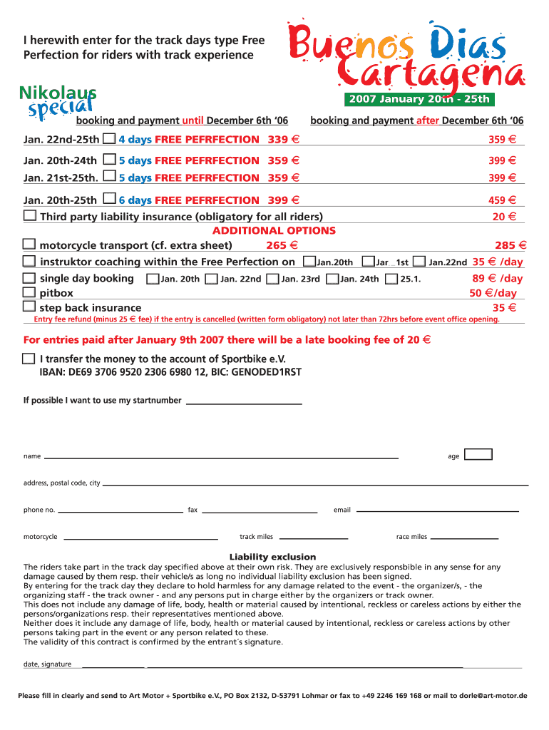 I herewith enter for the track days type Free Perfection for riders with track experience Nicolaus Buenos Días Cartagena special and payment until December 6th 06 booking 2007 January 20th 25th booking