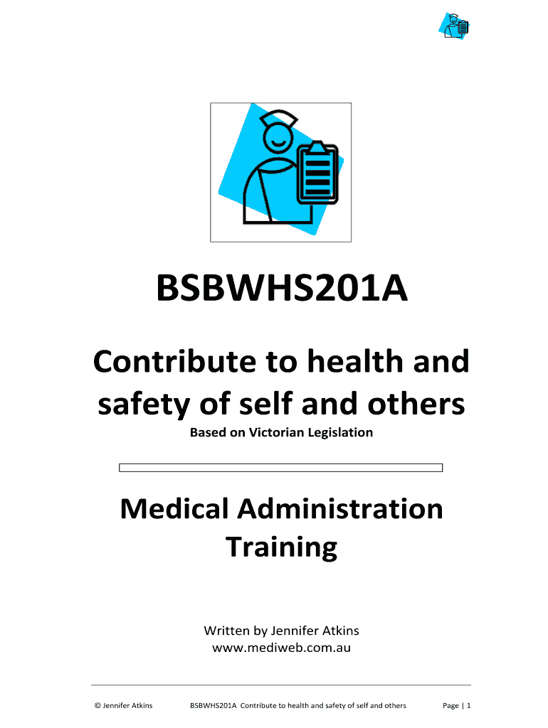 BSBWHS201A Contribute to health and safety of self and others Based on Victorian Legislation Medical Administration Training Written by Jennifer Atkins www.mediweb.com.au Jennifer Atkins BSBWHS201A