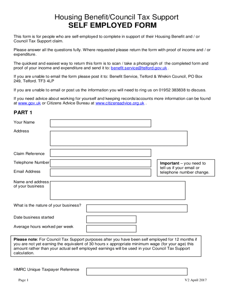Housing Benefit/Council Tax Support SELF EMPLOYED FORM This form is for people who are self-employed to complete in support of their Housing Benefit and / or Council Tax Support claim. Please answer