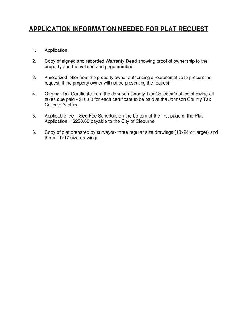Get the free APPLICATION INFORMATION NEEDED FOR PLAT REQUEST - bCleburneb TX
