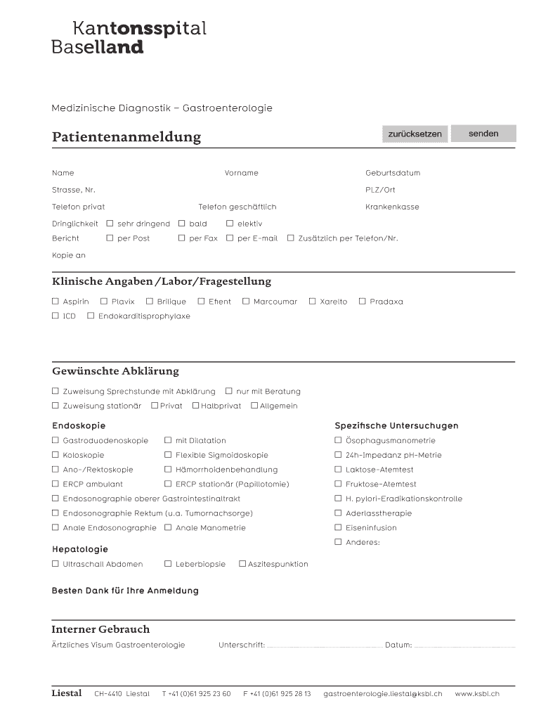 Medizinische Diagnostic Gastroenterology Patientenanmeldung sender zurcksetzen Name Surname Geburtsdatum Stress, NR. PLY×ORT Telephone private Telephone geschftlich Dringlichkeit seer fringed bald