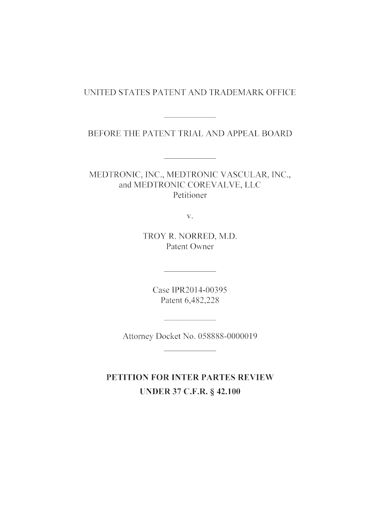 This document is a formal petition for inter partes review submitted to the Patent Trial and Appeal Board regarding U.S. Patent No. 6,482,228, detailing the grounds and supporting evidence for challenging