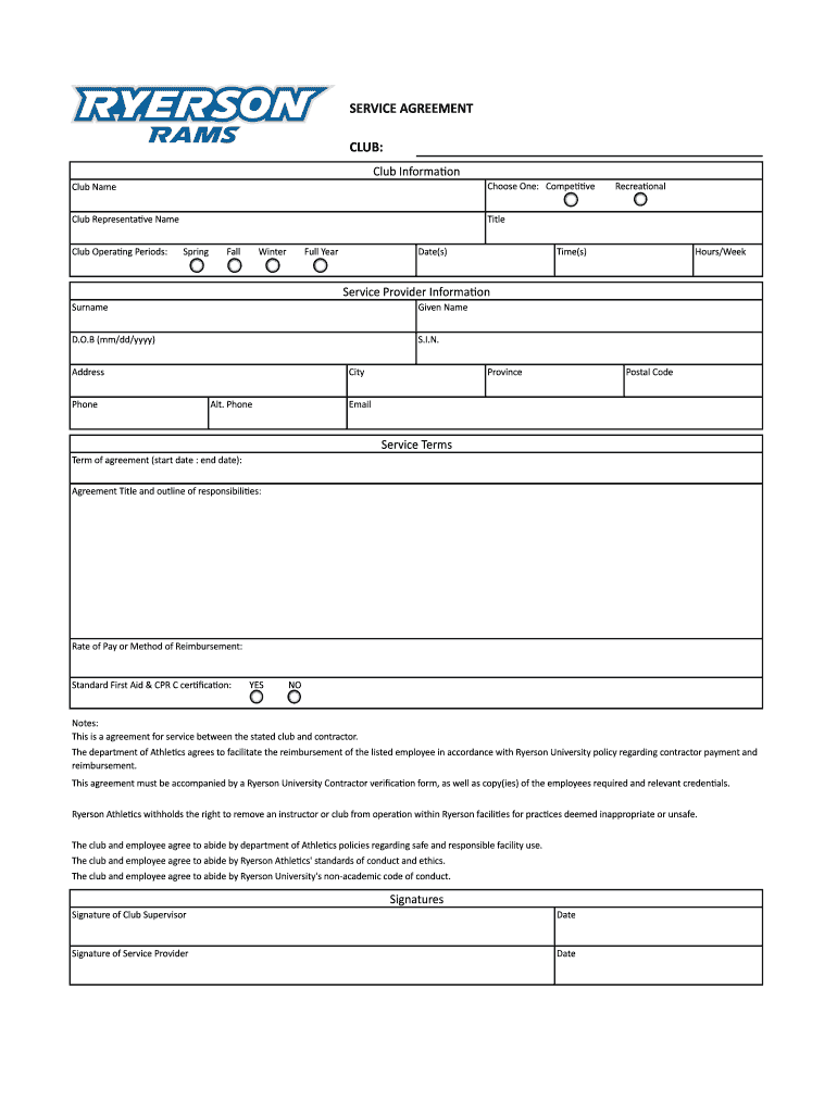 Get the free SERVICEAGREEMENT CLUB - Ryerson Rams - rec ryersonrams
