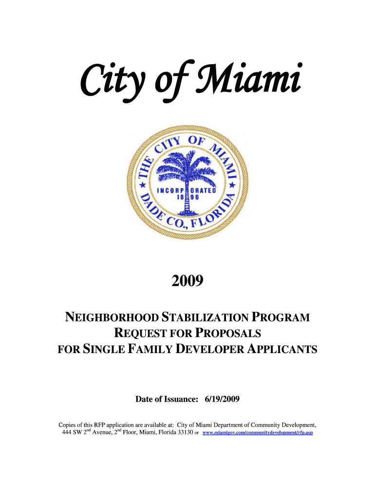 This document outlines the City of Miami's Request for Proposals for single family developer applicants to acquire, rehabilitate, and sell foreclosed properties under the Neighborhood Stabilization