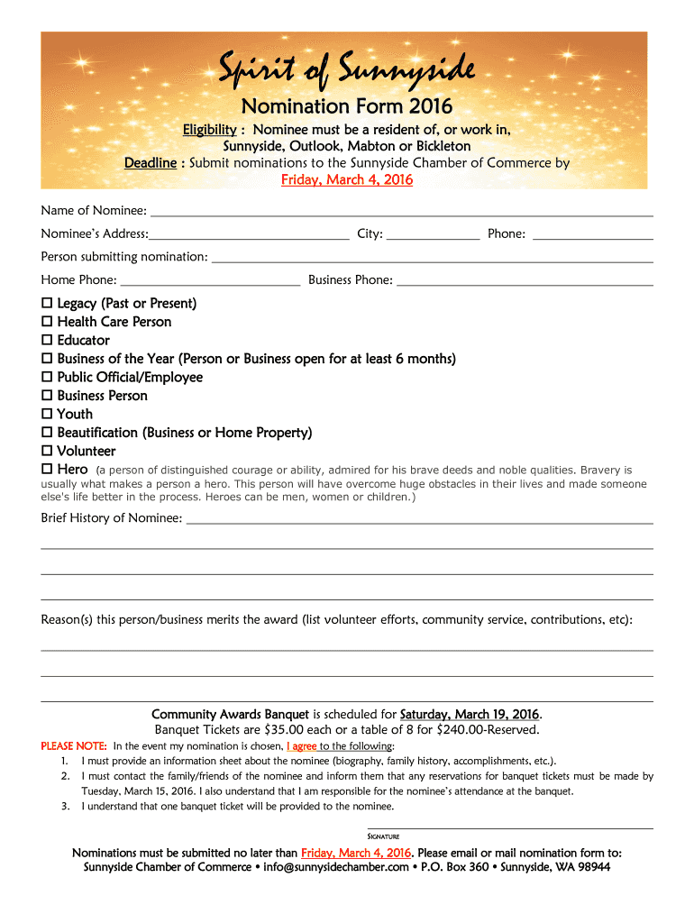Spirit of Sunnyside Nomination Form 2016 Eligibility : Nominee must be a resident of, or work in, Sunnyside, Outlook, Martin or Middleton Deadline : Submit nominations to the Sunnyside Chamber of