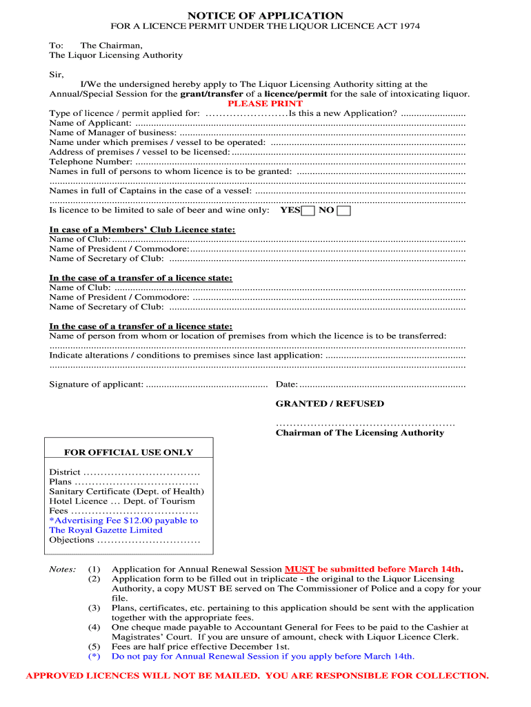 This document serves as an official application form for individuals or entities seeking a licence or permit for the sale of intoxicating liquor under the Liquor Licence Act of 1974.