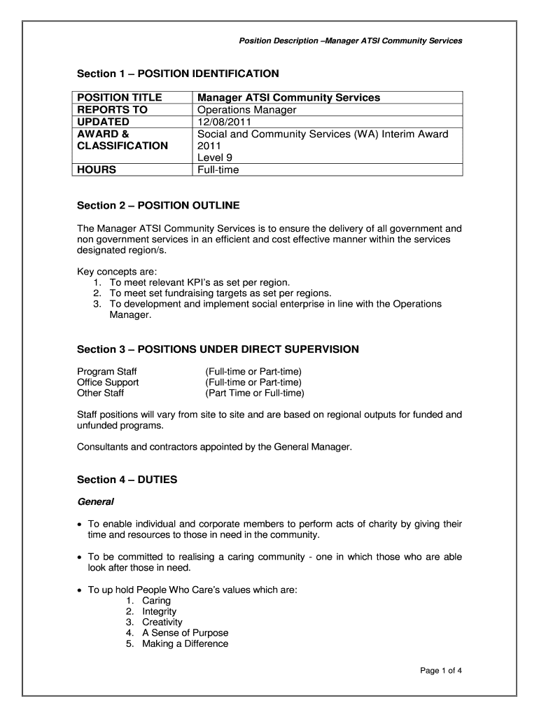 Position Description Manager ANSI Community Services Section 1 POSITION IDENTIFICATION POSITION TITLE REPORTS TO UPDATED AWARD & CLASSIFICATION HOURS Manager ANSI Community Services Operations Manager