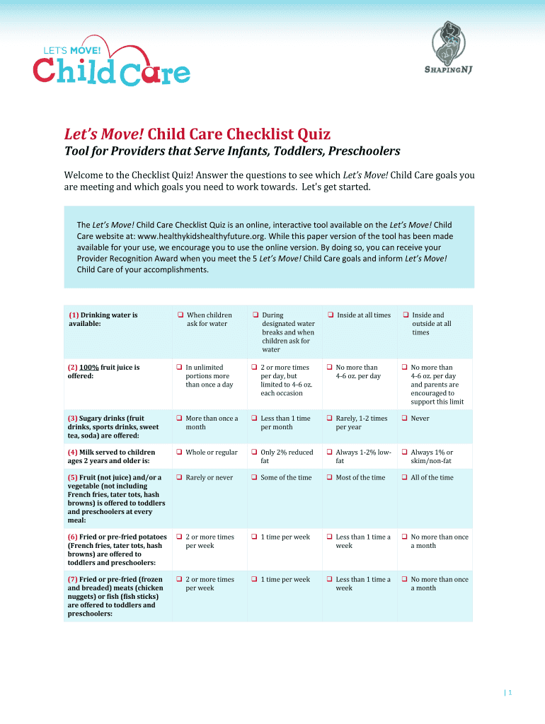 Welcome to the Checklist Quiz! Answer the questions to see which Lets Move! Child Care goals you