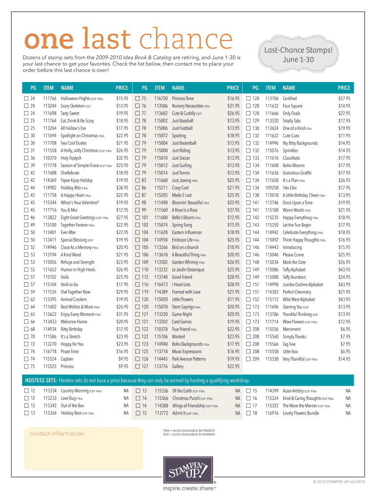 One last chance Last-Chance Stamps! June 1-30 Dozens of stamp sets from the 2009-2010 Idea Book & Catalog are retiring, and June 1-30 is your last chance to get your favorites. Check the list below,