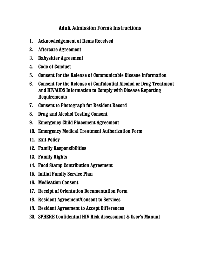 Adult Admission Forms Instructions 1. Acknowledgement of Items Received 2. Aftercare Agreement 3. Babysitter Agreement 4. Code of Conduct 5. Consent for the Release of Communicable Disease Information