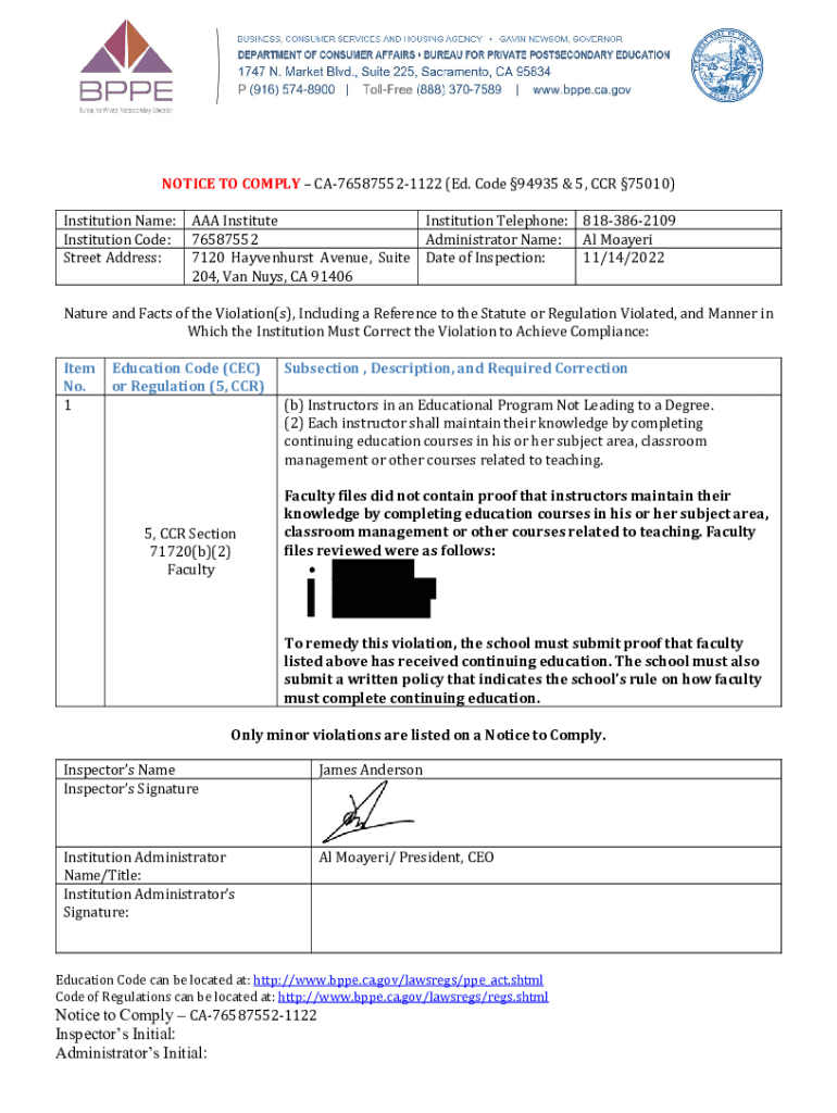 NOTICE TO COMPLY CA765875521122 (Ed. Code 94935 & 5, CCR 75010)Institution Name: Institution Code: Street Address:AAA Institute Institution Telephone: 8183862109 76587552 Administrator Names: Al Mayer