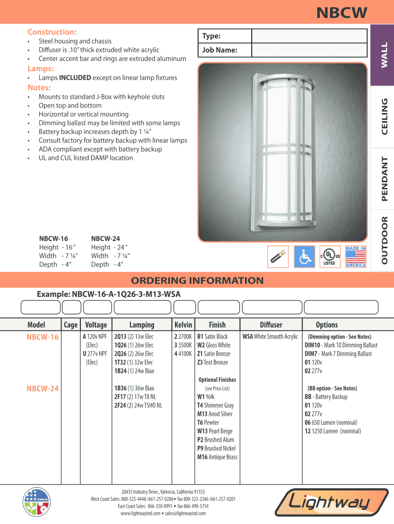 NBC Construction: Steel housing and chassis Diffuser is .10 thick extruded white acrylic Center accent bar and rings are extruded aluminum Lamps INCLUDED except on linear lamp fixtures Type: Mounts