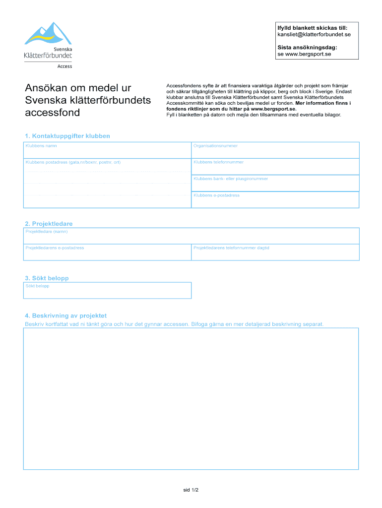 Get the free Blankett f r ans kan om bidrag ur Accessfonden - Svenska ... - bergsport