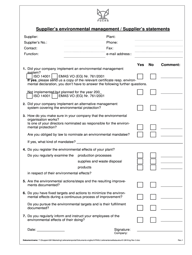 Suppliers environmental management / Suppliers statements Supplier: Plant: Suppliers No.: Phone: Contact: Fax: Function: email address:: Yes 1. Did your company implement an environmental management