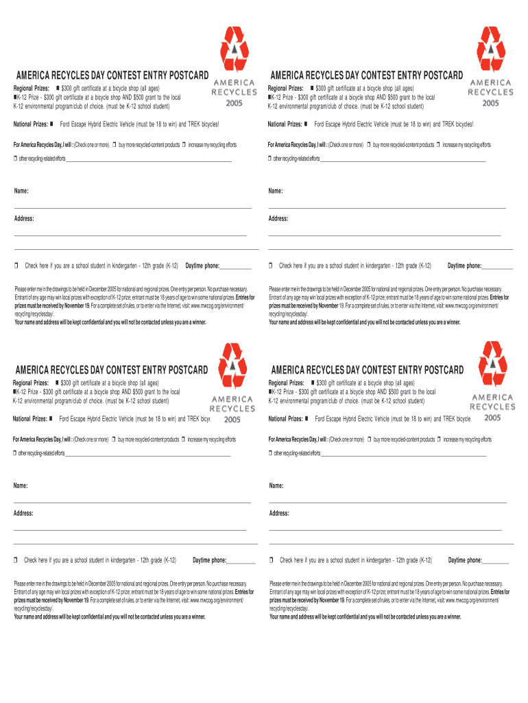 No supporting documents are specified in the form metadata for the America Recycles Day Contest Entry Postcard, but ensure your contest entry details are complete.