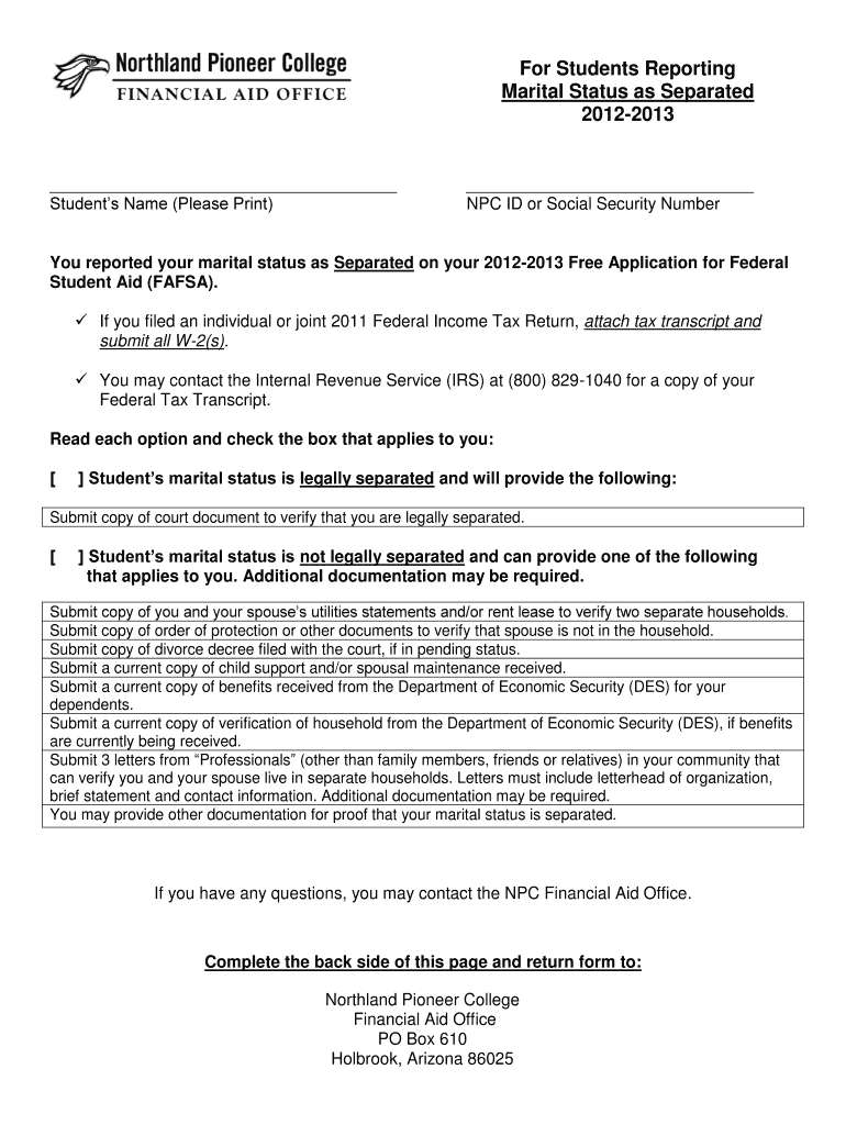 This form is used by students to report their marital status as separated for the 2012-2013 FAFSA and to provide necessary documentation and financial information.