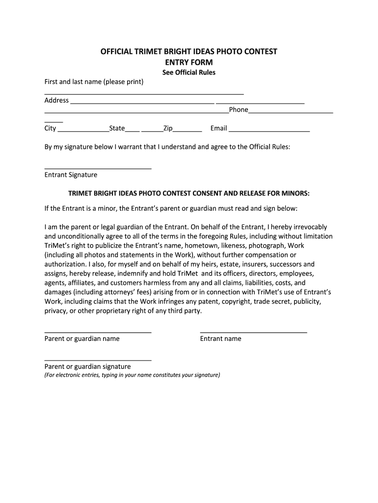 Participants who wish to enter the TRIMET BRIGHT IDEAS PHOTO CONTEST are required to file this form to officially submit their entries.