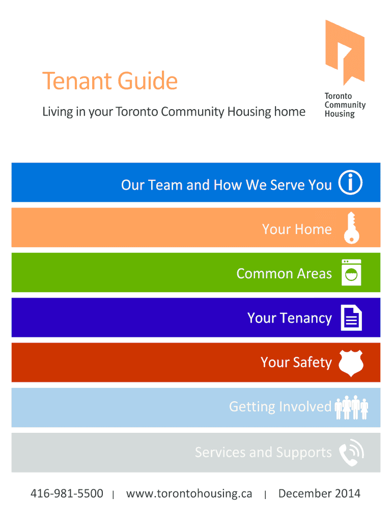 Tenant Guide Living in your Toronto Community Housing home Our Team and How We Serve You Your Home Common Areas Your Tenancy Your Safety Getting Involved Services and Supports 4169815500 www.torontohousing.ca