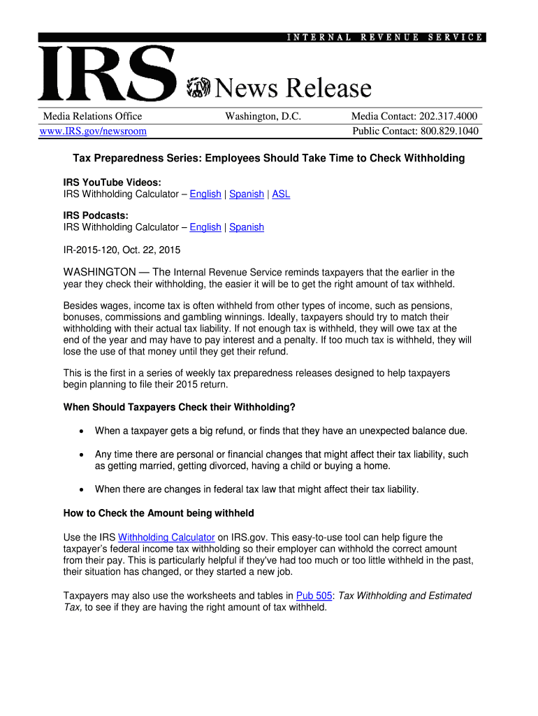 Media Relations Office www.IRS.gov×newsroom Washington, D.C. Media Contact: 202.317.4000 Public Contact: 800.829.1040Tax Preparedness Series: Employees Should Take Time to Check Withholding IRS YouTube