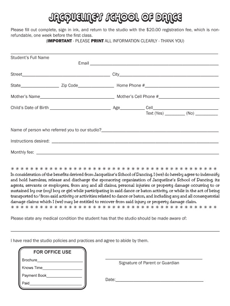 JACQUELINE SCHOOL OF DANCE Please fill out complete, sign in ink, and return to the studio with the $20.00 registration fee, which is nonrefundable, one week before the first class. (IMPORTANT PLEASE