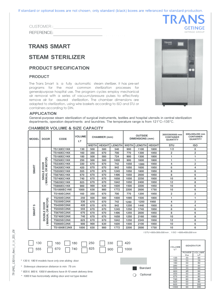 If standard or optional boxes are not chosen, only standard (black) boxes are referenced for standard production. TRANS SMART STEAM STERILIZER PRODUCT SPECIFICATION PRODUCT The Trans Smart is a fully