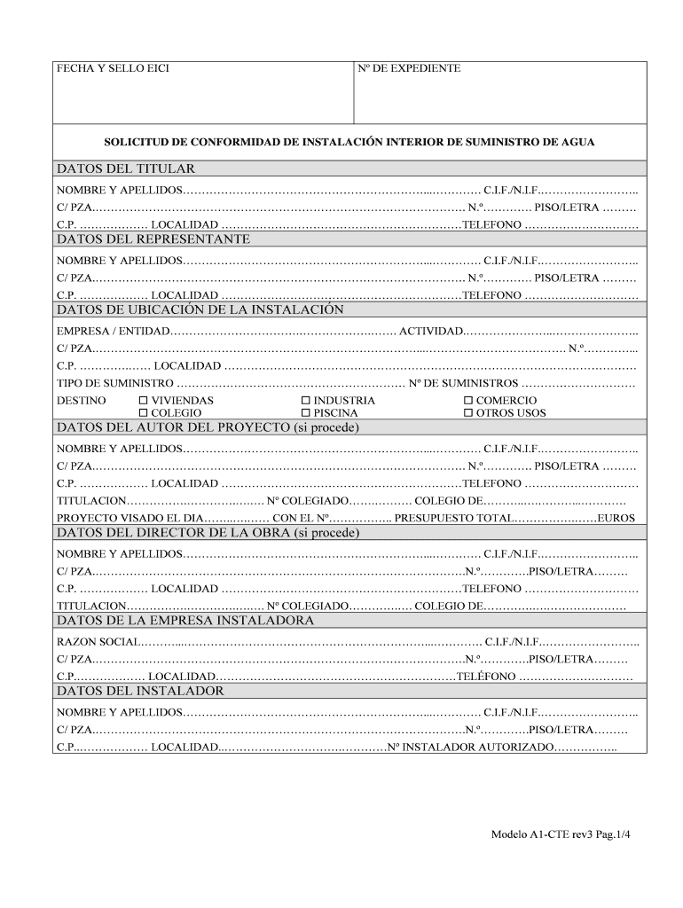 FEC HA Y SELL EIC N DE EXPEDIENT SOLICITED DE CONFORMING DE INSTALLATION INTERIOR DE MINISTRY DE AGRA DATES DEL TITULAR HOMBRE Y SPELLINGS.... C.I.F.×N.I.F... C/ PA. N. PESO×PETRA C.P. LOCALIZED