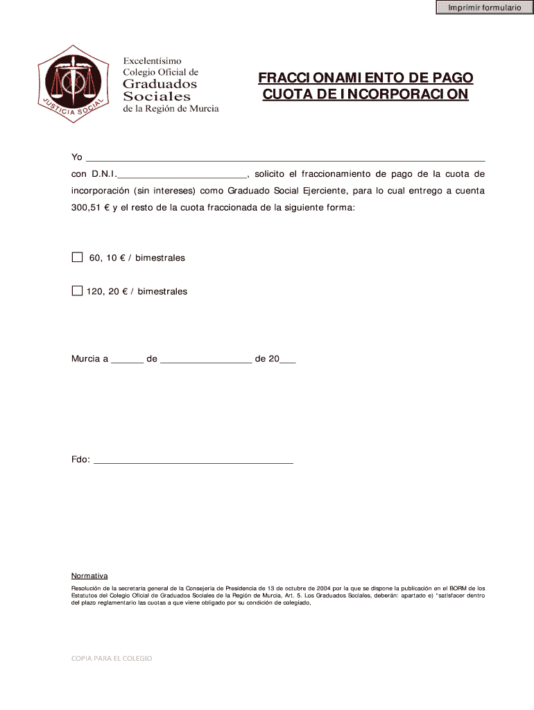 Imprimis formulation FRACCIONAMIENTO DE PAGO QUOTA DE INCORPORATION To con D.N.I., solicitor el fraccionamiento de Pago de la quota DE incorporating (sin interests) Como Graduate Social Ejerciente,