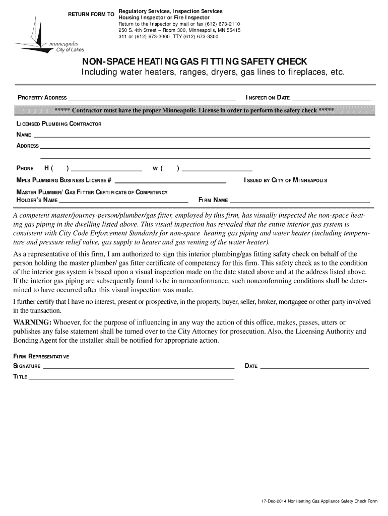 Get the free Non-space Heating gas fitting Safety Check form - minneapolismn