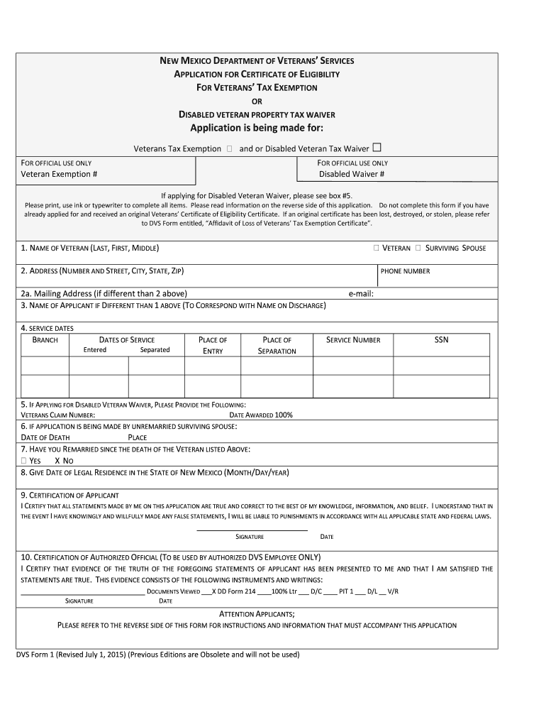 NEW MEXICO DEPARTMENT OF VETERANS SERVICES APPLICATION FOR CERTIFICATE OF ELIGIBILITY FOR VETERANS TAX EXEMPTION OR DISABLED VETERAN PROPERTY TAX WAIVER Application is being made for: Veterans Tax