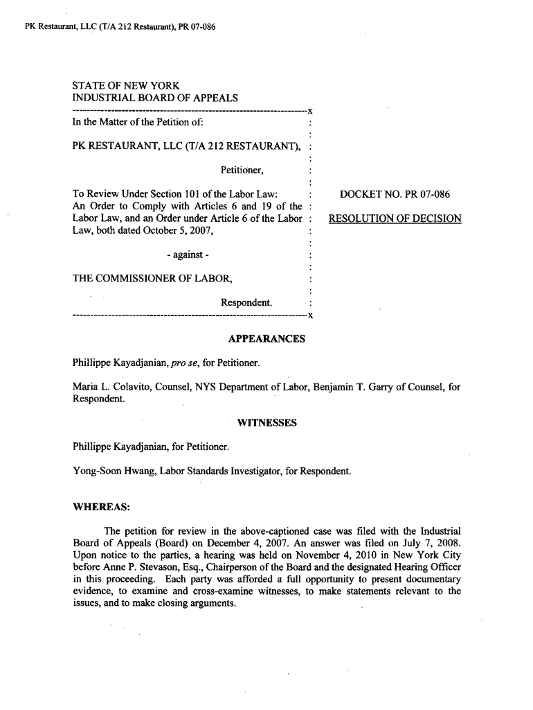 PK Restaurant, LLC (T×A 212 Restaurant×, PR 07086STATE OF NEW YORK