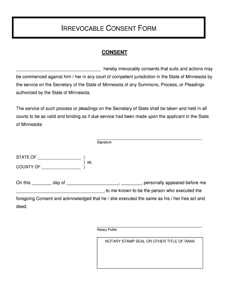 IRREVOCABLE CONSENT FORM CONSENT hereby irrevocably consents that suits and actions may be commenced against him / her in any court of competent jurisdiction in the State of Minnesota by the service