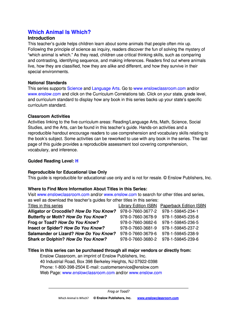 Which Animal Is Which? Introduction This teacher s guide helps children learn about some animals that people often mix up. Following the principle of science as inquiry, readers discover the fun of