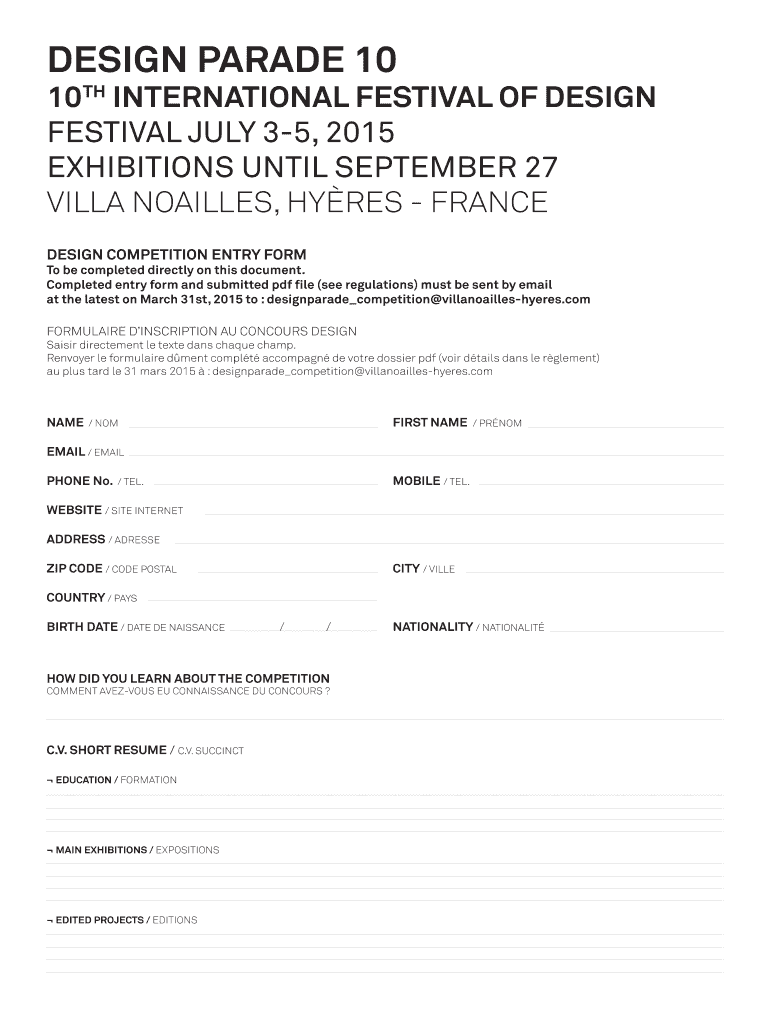 DESIGN PARADE 10 10TH INTERNATIONAL FESTIVAL OF DESIGN FESTIVAL JULY 35, 2015, EXHIBITIONS UNTIL SEPTEMBER 27 VILLA BRAILLES, HIRES FRANCE DESIGN COMPETITION ENTRY FORM To be completed directly on