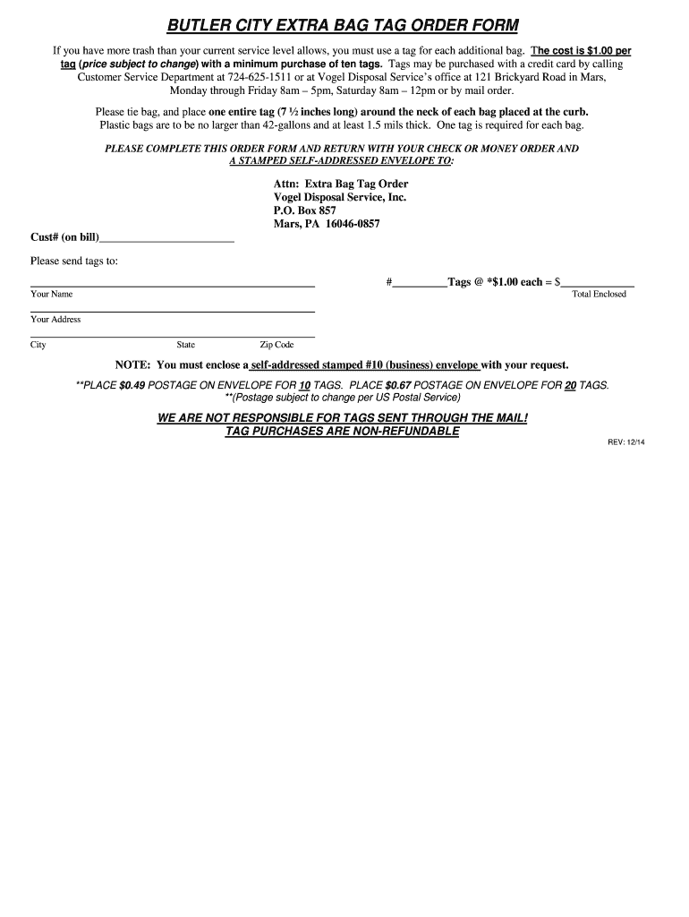 BUTLER CITY EXTRA BAG TAG ORDER FORM If you have more trash than your current service level allows, you must use a tag for each additional bag. The cost is $1.00 per tag (price subject to change)