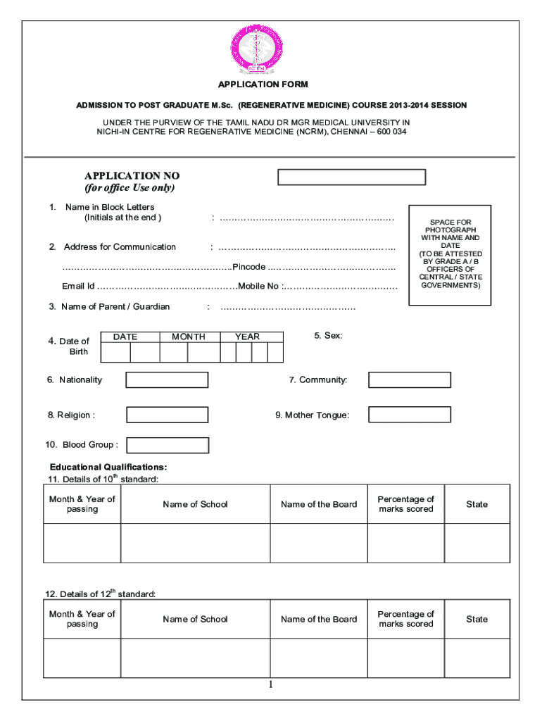 APPLICATION FORM ADMISSION TO POST GRADUATE M.Sc. (REGENERATIVE MEDICINE) COURSE 20132014 SESSION UNDER THE PURVIEW OF THE TAMIL NADU DR MGR MEDICAL UNIVERSITY IN NICHIIN CENTRE FOR REGENERATIVE MEDICINE