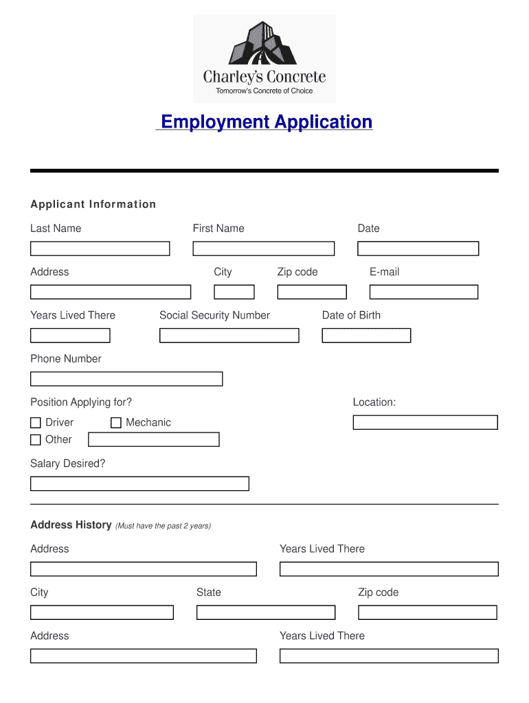 Employment Application Applicant Information Last Name First Name Address City Years Lived There Social Security Number Date Zip code Email Date of Birth Phone Number Position Applying for? Driver