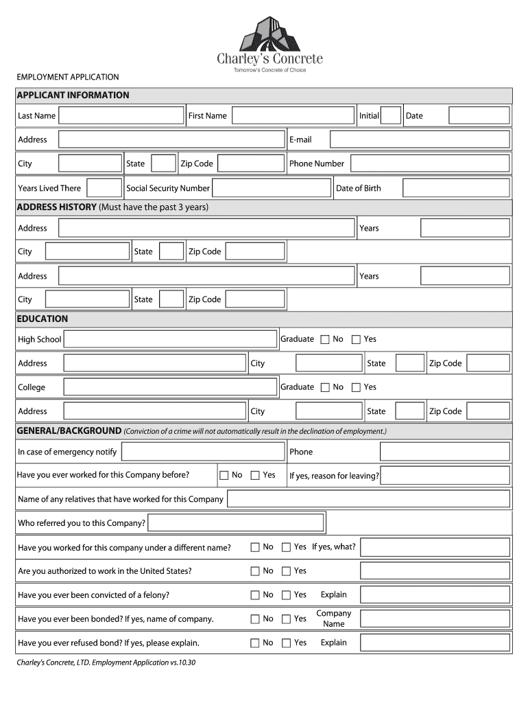 EMPLOYMENT APPLICATION APPLICANT INFORMATION Last Name First Name Initial Address Date Email City State Zip Code Years Lived There Social Security Number Phone Number Date of Birth ADDRESS HISTORY