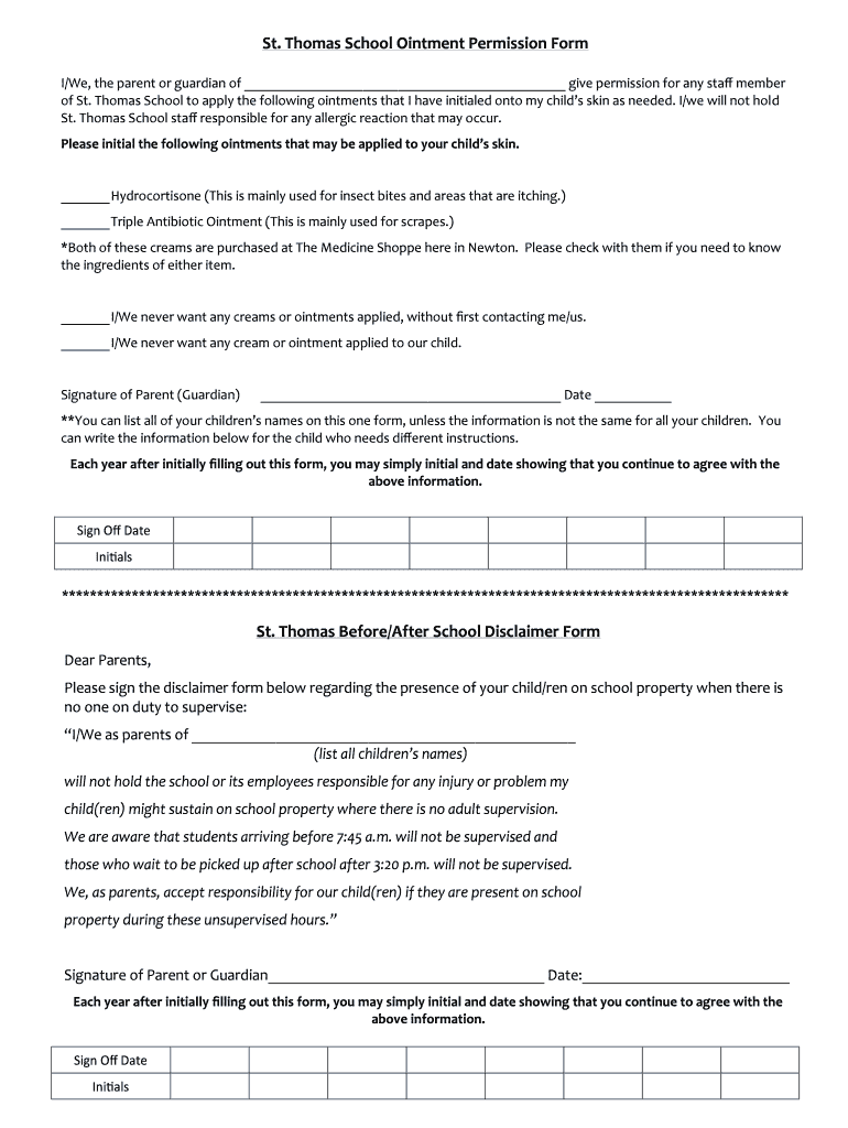 St. Thomas School Ointment Permission Form I×We, the parent or guardian of give permission for any staff member of St. Thomas School to apply the following ointments that I have initialed onto my