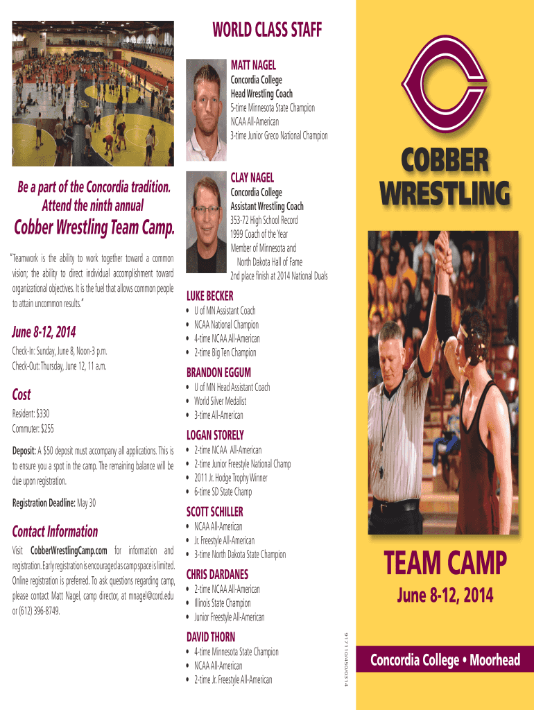 WORLD CLASS STAFF MATT NAGEL Concordia College Head Wrestling Coach 5time Minnesota State Champion NCAA All American 3time Junior GREC National Champion Be a part of the Concordia tradition. Attend