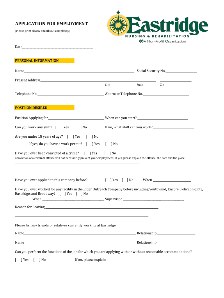 Get the free APPLICATION FOR EMPLOYMENT - Eastridge Nursing and - eastridgenursing