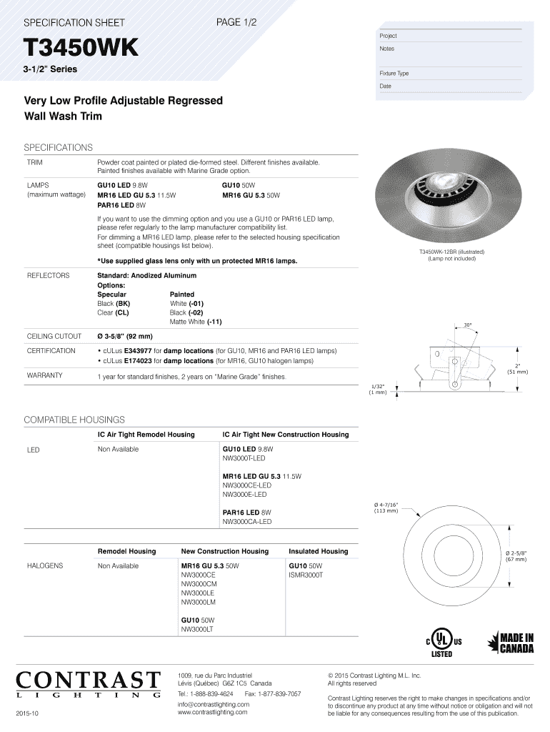 PAGE 1×2 SPECIFICATION SHEET Project T3450WK Notes 31×2 Series Fixture Type Date Very Low Profile Adjustable Regressed Wall Wash Trim SPECIFICATIONS TRIM Powder coat painted or plated deformed steel.