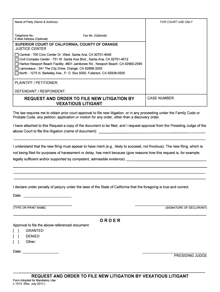 Name of Party (Name & Address): FOR COURT USE ONLY Telephone No.: Email Address (Optional): Fax No. (Optional): SUPERIOR COURT OF CALIFORNIA, COUNTY OF ORANGE JUSTICE CENTER Central 700 Civic Center