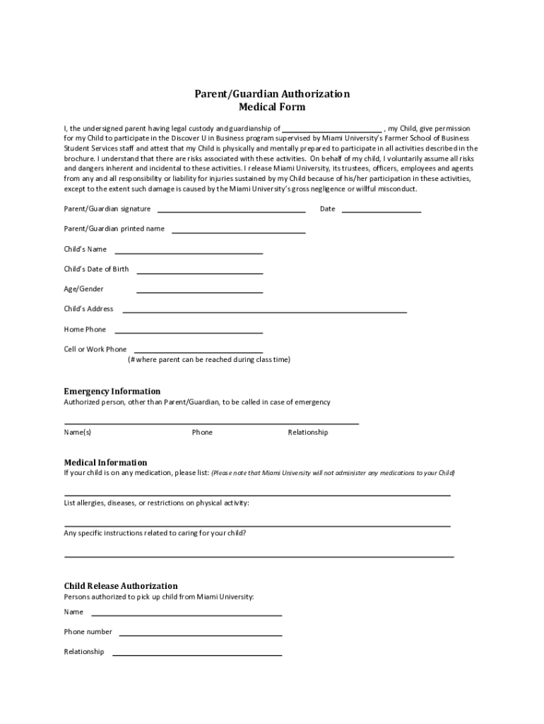 Parent/Guardian Authorization Medical Form I, the undersigned parent having legal custody and guardianship of, my Child, give permission for my Child to participate in the Discover U in Business program
