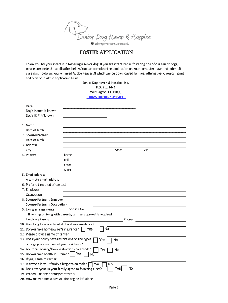 FOSTER APPLICATION Thank you for your interest in fostering a senior dog. If you are interested in fostering one of our senior dogs, please complete the application below. You can complete the application